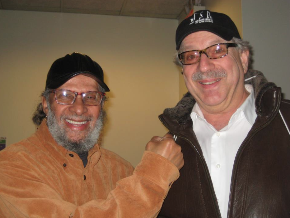New York NY -- Main Men Jimmy Wormworth jazz drummer extraordinaire and one of oldest friends bandmates George Braith outside Metropolitan Room on 22nd St. at Jimmy's Ain't No Jive 75 Birthday Party - photo Jon Hammond