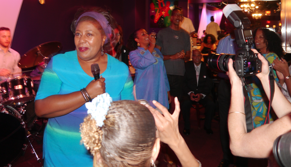 New York NY -- Jimmy Wormworth 75-Ain't-No-Jive Party - Jimmy's family with daughter Holly Wormworth at the microphone and 2 of the jazz angels from Jazz Foundation of America - Marianne Pillsbury and Gina Reder aka Gina Jazz - Jon Hammond incredibly great party!