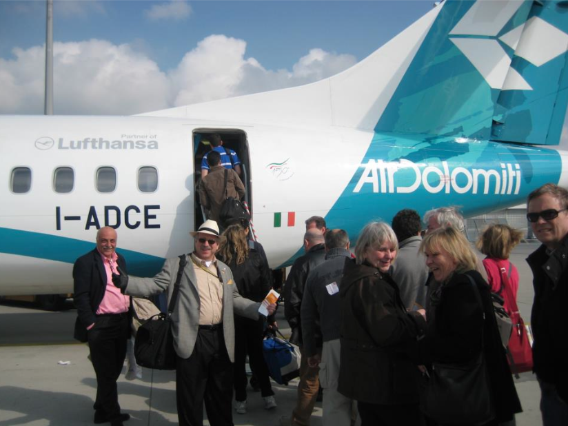 Frankfurt Germany -- Coffee Time With The Boys - getting ready for 26th consecutive Musikmesse Frankfurt L to R: Joe Berger, Tino Pavlis, Jon Hammond, Frank Poehl — with Joe Berger, Tino Pavlis and Frank Poehl at Frankfurt Sachsenhausen.