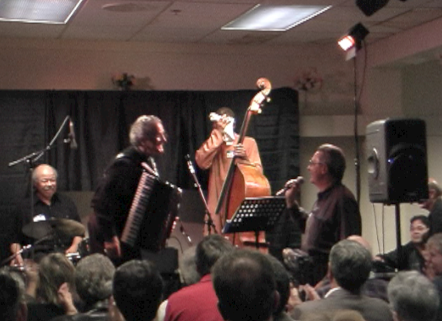 New York NY -- Harlem Blues and Jazz Band Musicians Michael Max Fleming bass, 97 year old Fred Staton living legend tenor saxophonist, Art Baron trombone, Jackie Williams drums - playing for Zeke Mullins' birthday party - Zeke played piano in house rhythm section that night at Local 802 Monday Night Jazz Session sponsored by Jazz Foundation of America - Jon Hammond