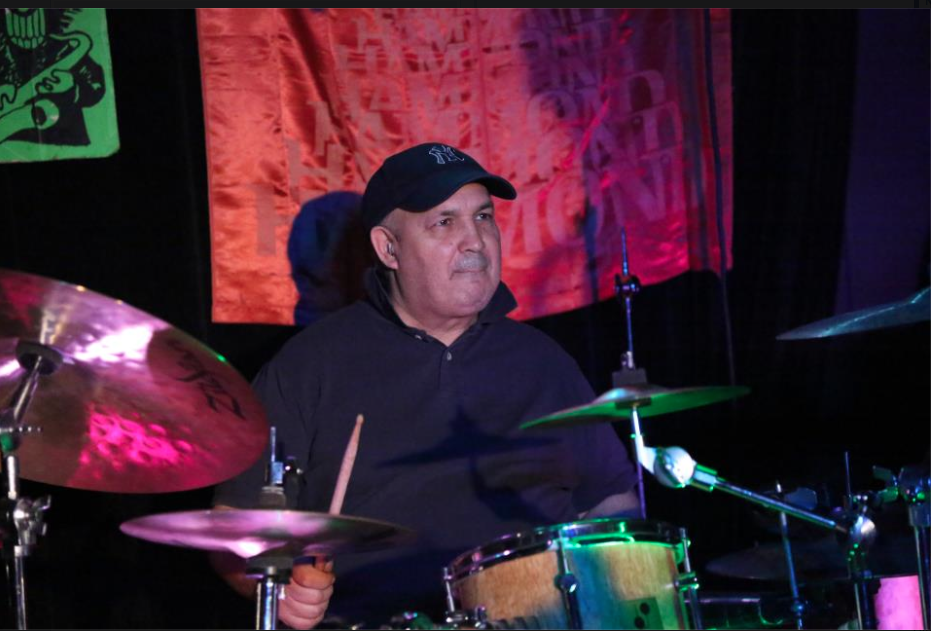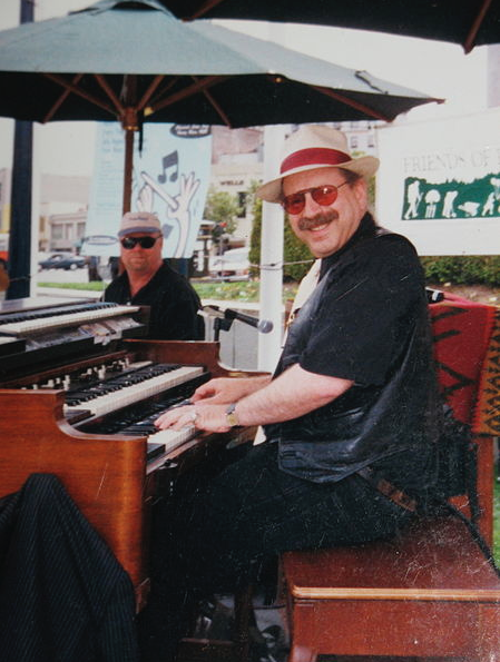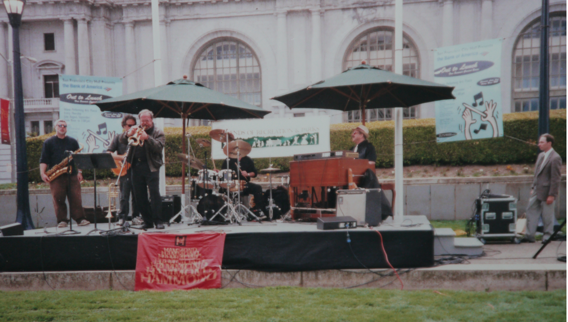 San Francisco California -- Jon Hammond Band Lunchtime Gig in front of San Francisco City Hall - shown James Preston drums Jon Hammond at 1965 B3 Hammond organ