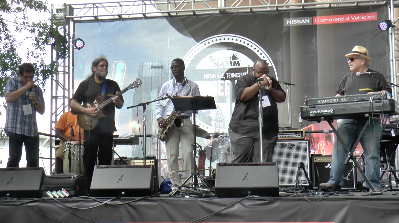 Nashville, Tennessee -- 2PM Sharp Hit on Nissan Stage, FULL HighDef Jon Hammond Funk Unit: Lee Oskar special guest harmonica, Chuggy Leslie J. Carter percussion, Louis Flip Winfield drums, Cord Martin tenor saxophone, Roland Barber trombone, Jon Hammond organ - Greg Herreman productions manager, Michael Apodaca & Alex Moore audio / Sound Image Nashville https://www.namm.org/thenammshow/2016/events/jon-hammond-funk-unit - The NAMM Show Summer NAMM Show