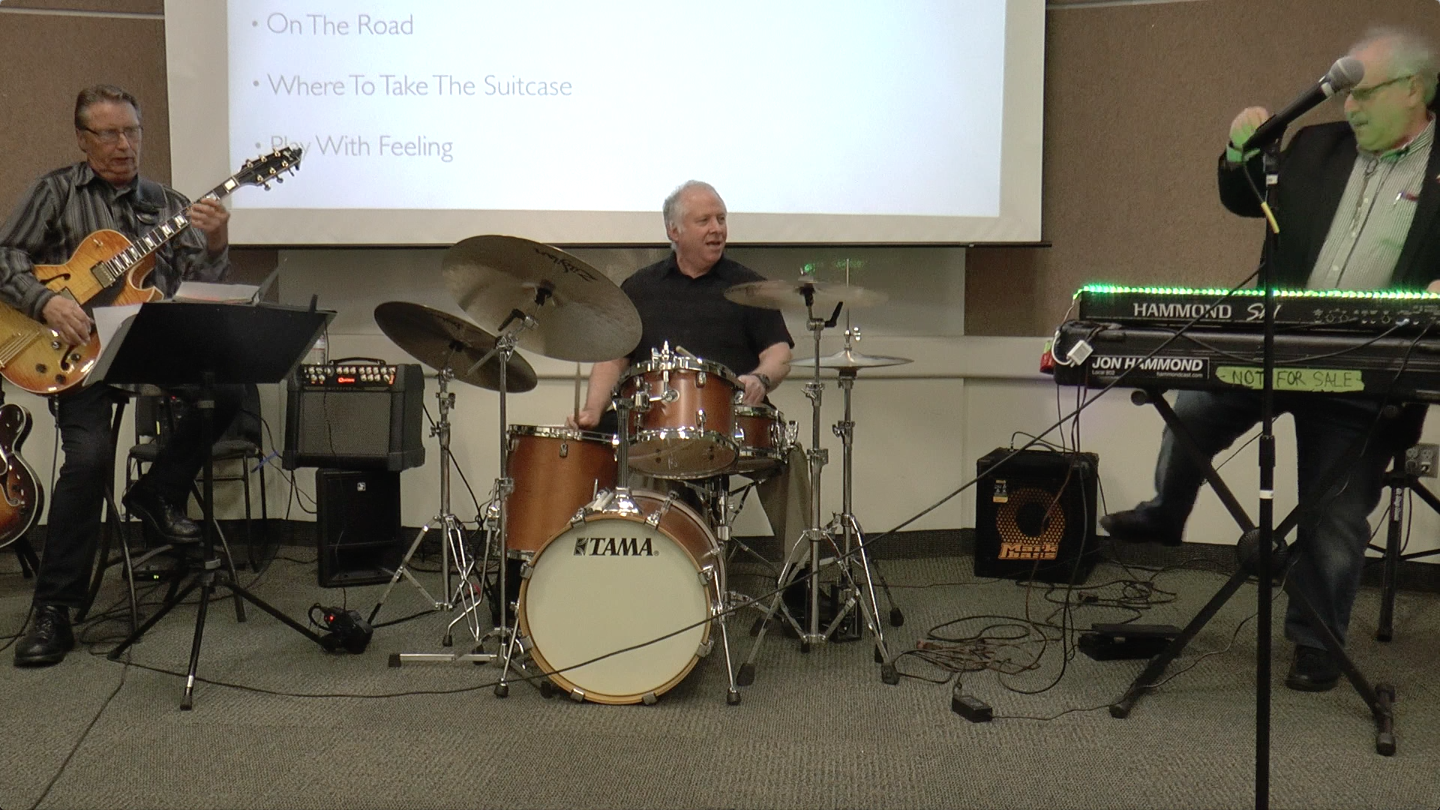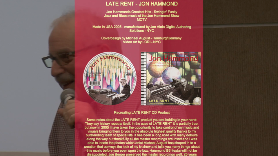 the Late Rent story, and plays theme song for Jon Hammond Show with Rich Severson guitar, Gary Newmark drums in the Fresno Library JazzFresno