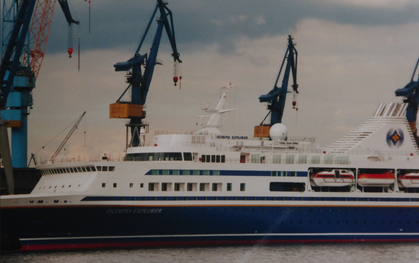Hamburg, Germany-- Amazing image of the ill fated "Olympia Explorer" fast Cruise Ship while it sat in the Blohm+Voss ship yard Hamburg for the longest time - amazing story about my friend Andy Christo's ROYAL OLYMPIC CRUISES ship - too long to write here! - Photo by Michael August