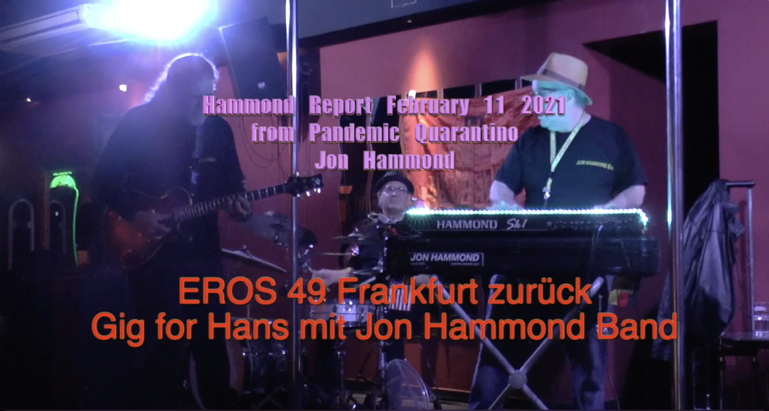 - Hammond Report February 11 2021 From Pandemic Quarantino Jon Hammond - Daily Music and Stories from the organist & accordionist Jon Hammond, today's music story about playing my theme song "Late Rent" in 's red light at 's "Eros 49 Club" aka on the Elbe Strasse - squeezed between the 2 famous poles - when we arrived, we found Hans' DJ mixing board we had plugged in to the previous year was broken, so we had to get very resourceful and with help from our friends we got a sound! Tenor saxophonist magically appeared, superb long-time drummer laying it down with 'Berger-Meister' guitar and yours truly at the Sk1 Hammond organ - enjoy folks, and come back tomorrow for another Hammond Report!Jon Hammond