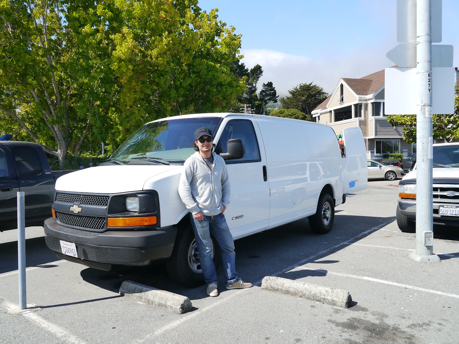 Sausalito California -- The Adventures of Takamitsu Yashiro 'Taka Blue Groove' - with Chevy Van at Taste of Rome Cafe in very lucky parking space -